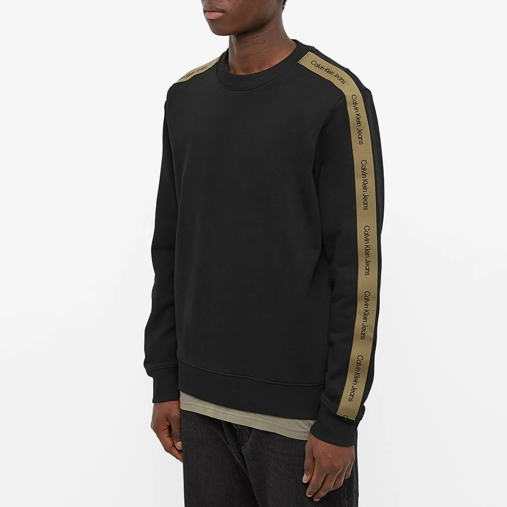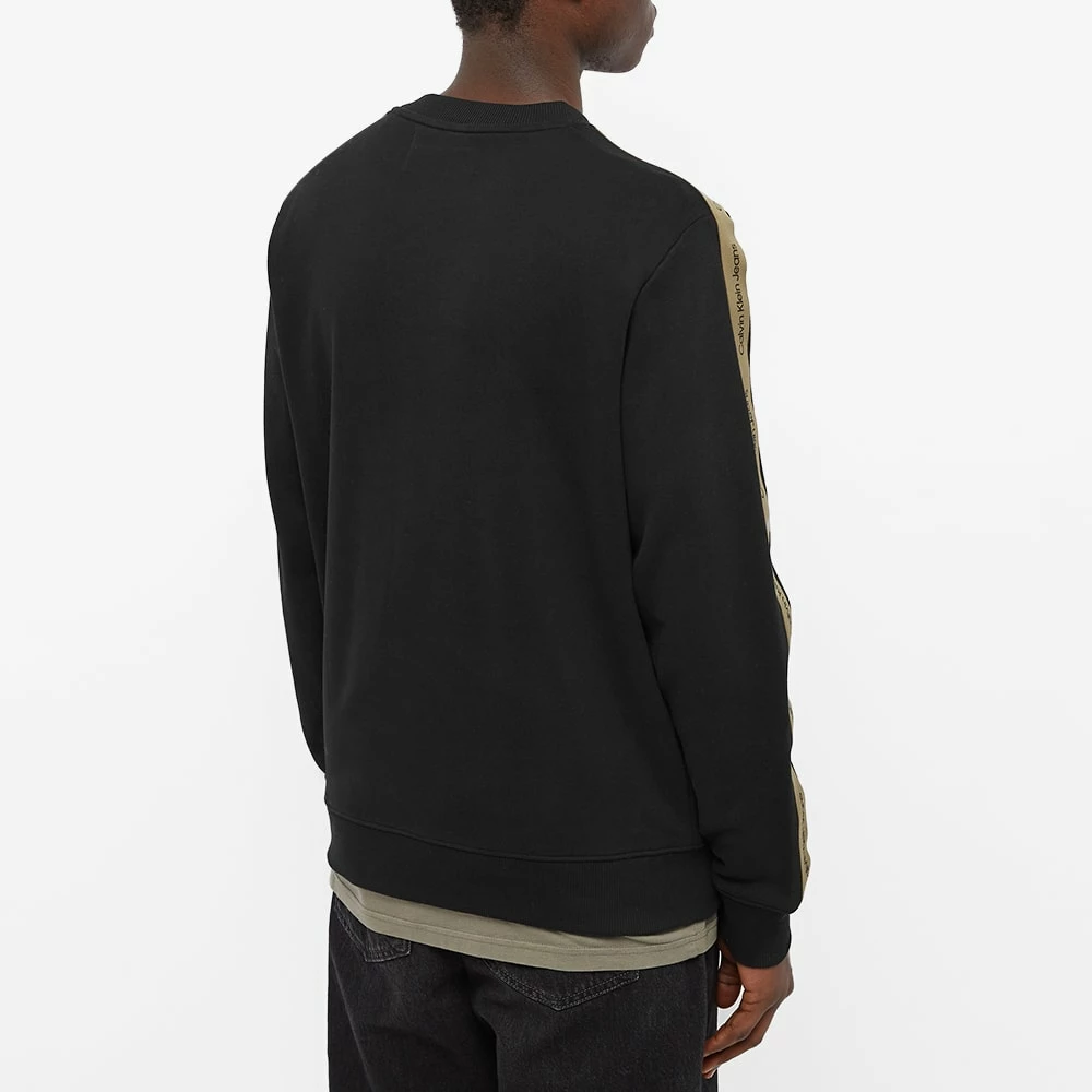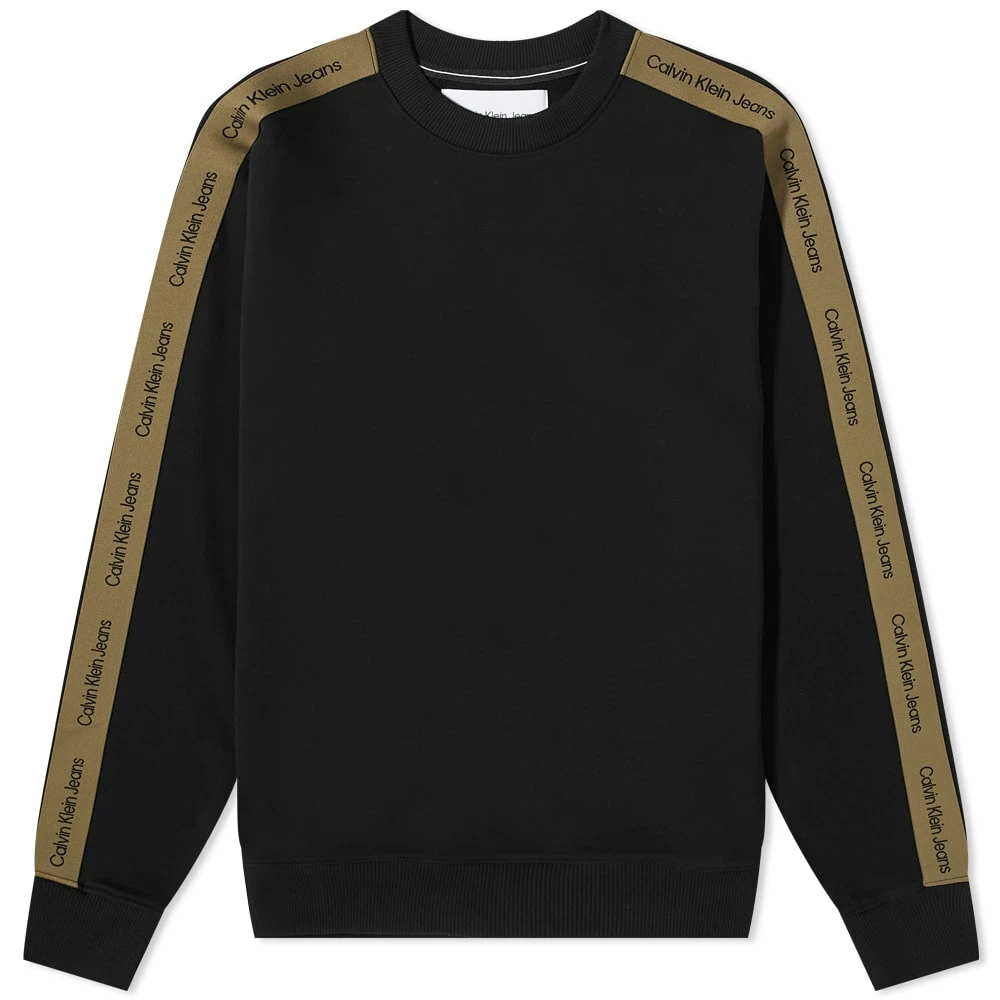 Calvin Klein opt for a sporty style with this classic black crew sweat. Crafted from soft cotton, it features ribbed trims for a snug fit- making it perfect for laid-back days- and is complete with khaki branded tape down each sleeve.