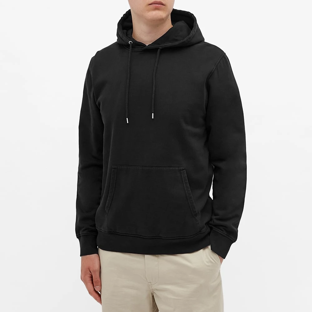 This black cotton hoody is a staple piece from the jersey experts at Colorful Standard. Lined with a fleecy interior, it comes with an adjustable drawstring hood, a handy kangaroo pocket and cosy ribbed trims.