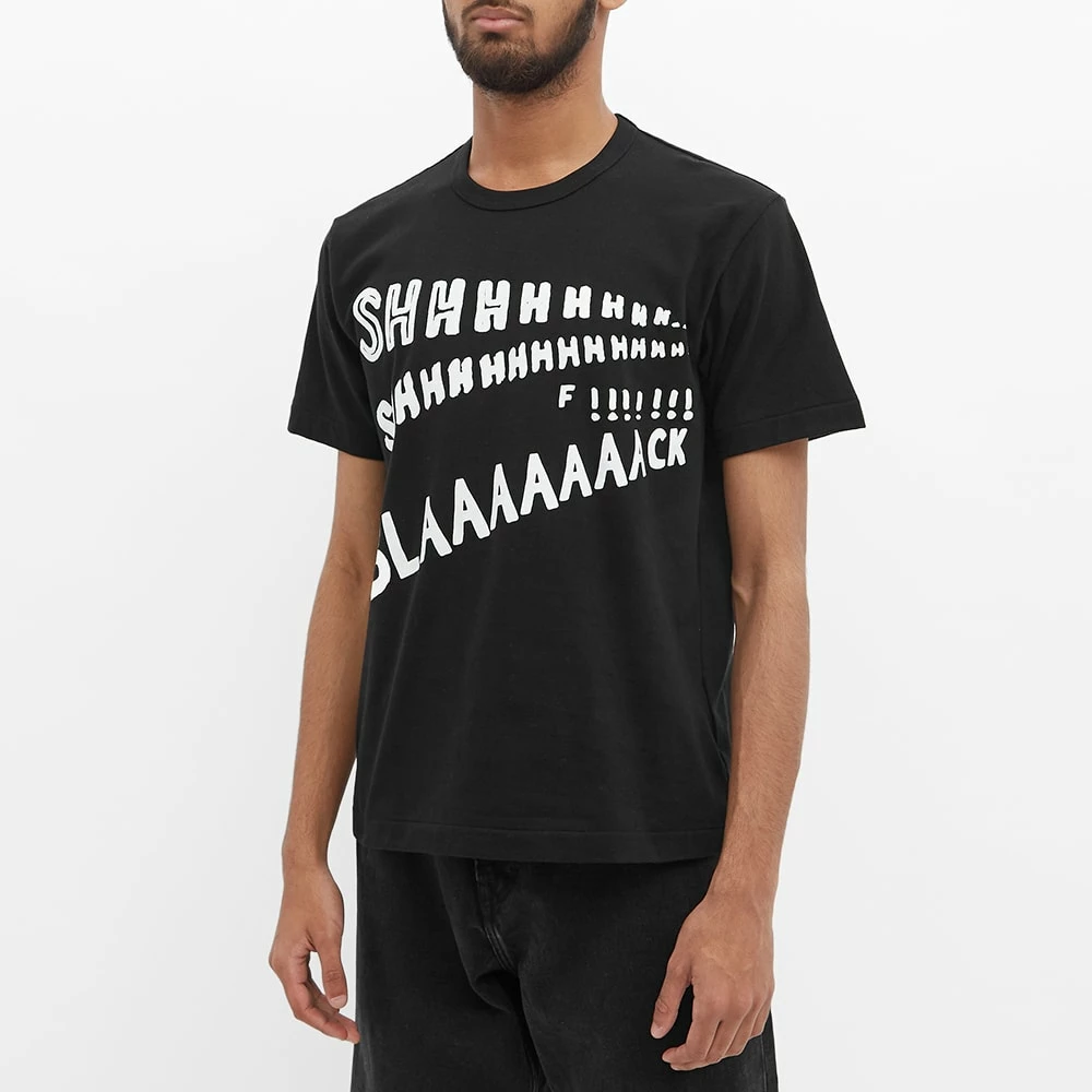 This black “Shhhhh” tee from Comme des Garçons Black is anything but quiet, with white block lettering covering the front. Made in Japan from cotton, it’s cut to a relaxed fit for a casual staple with the brand’s typical playful touch.