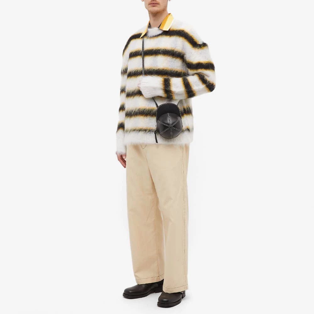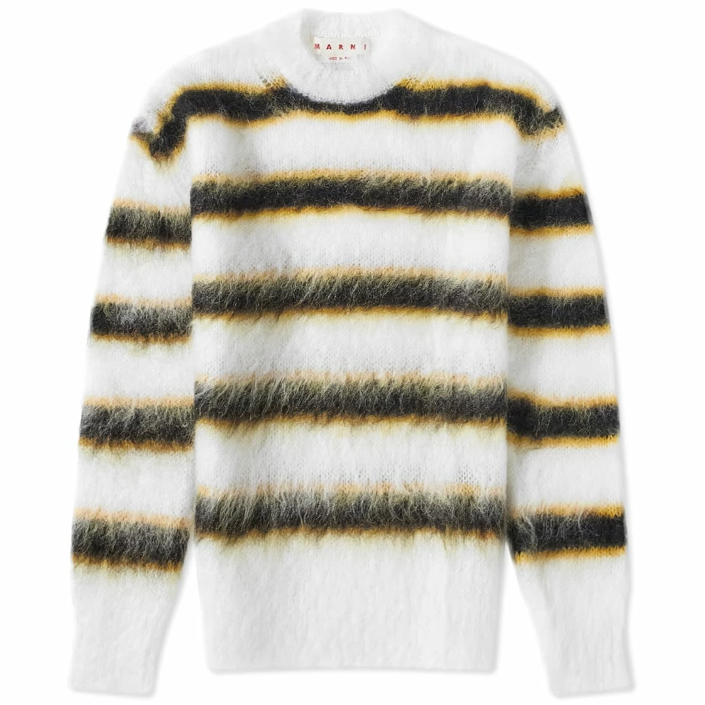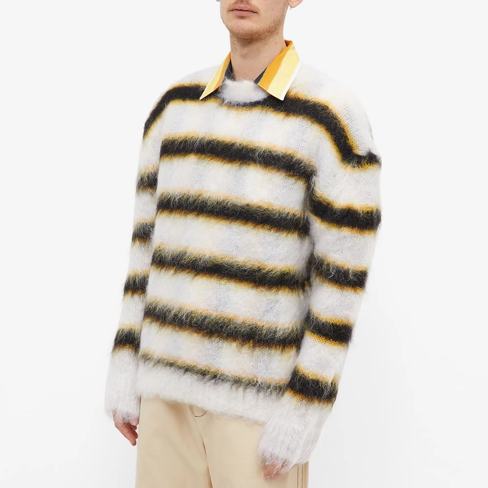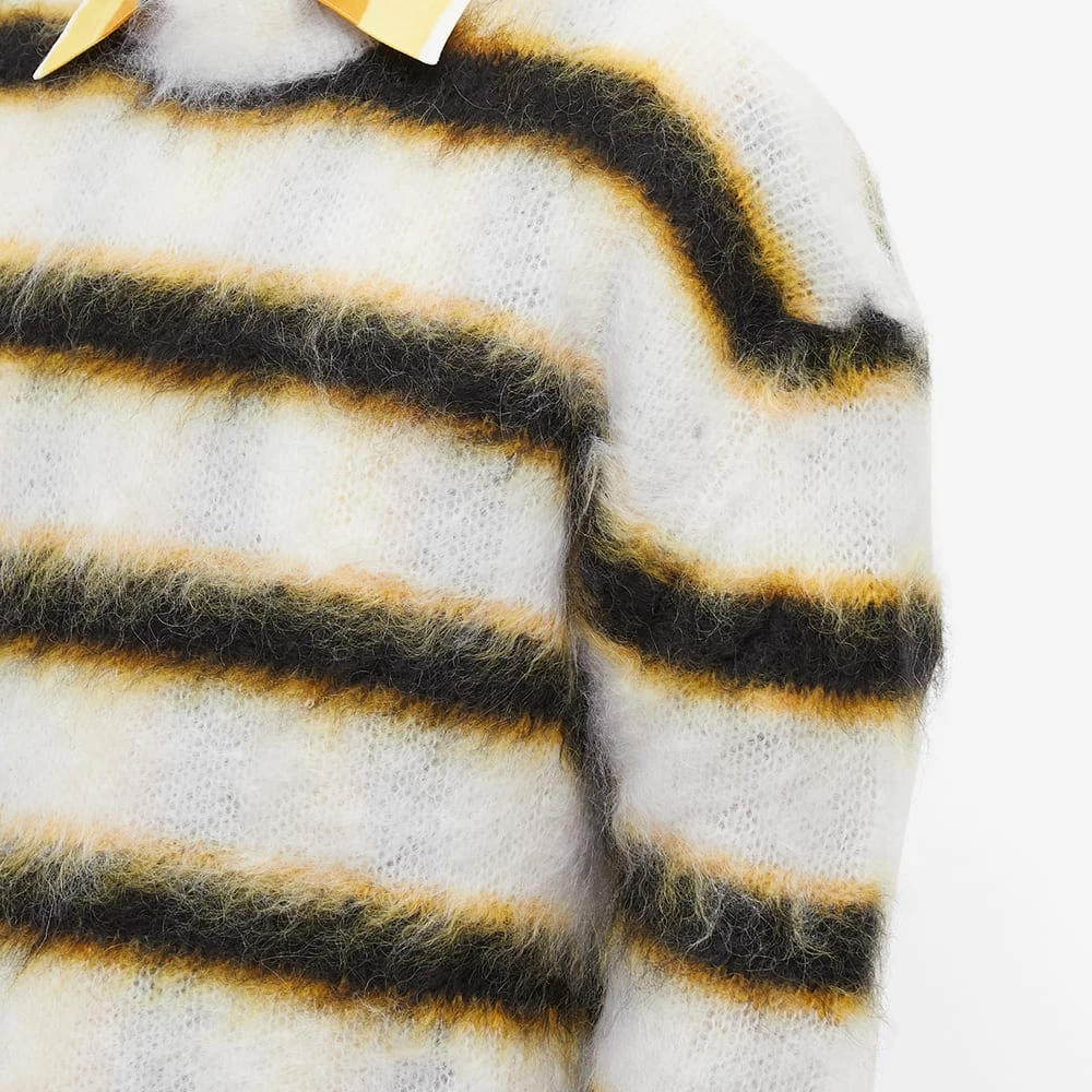As always, Marni’s knitwear is bold. A fluffy white mohair crewneck covered in black and yellow stripes, this sweater is sure to bring some colour to your cold weather line-up.