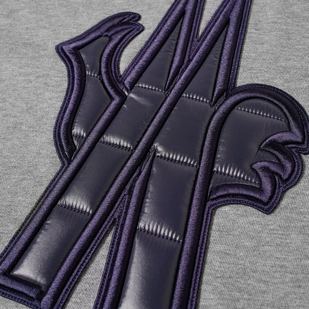 Moncler Grenoble’s branding is, literally, standout on this tee. The famous cockerel details the grey cotton jersey’s chest, formed with quilted navy nylon— the kind you see on the brand’s famous ski jackets— overlaid with thick tonal embroidery.