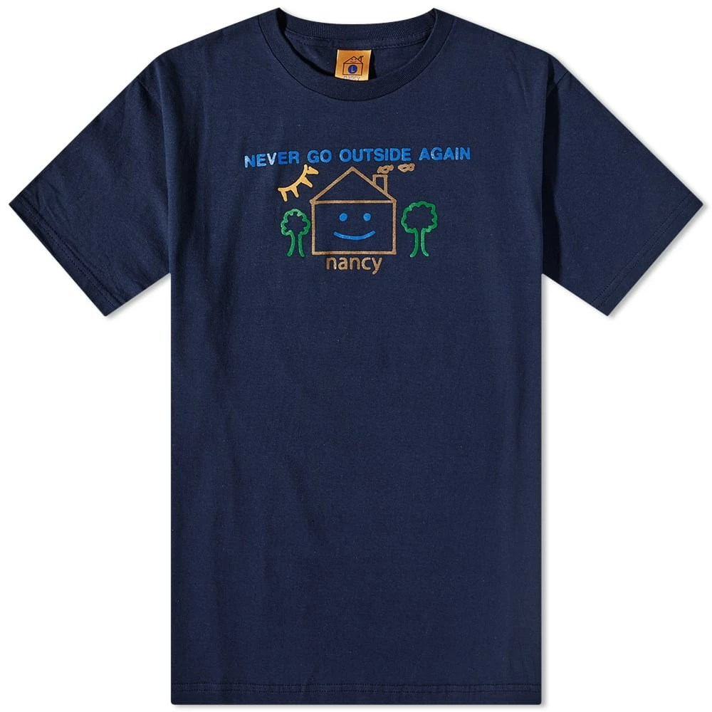 Sam Hughes channels skateboarding, punk and his own personal style into a collection of graphic heavy clothing for his London label – Nancy. Playful artwork is printed on this colourful tee, hand-drawn for a DIY aesthetic.