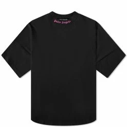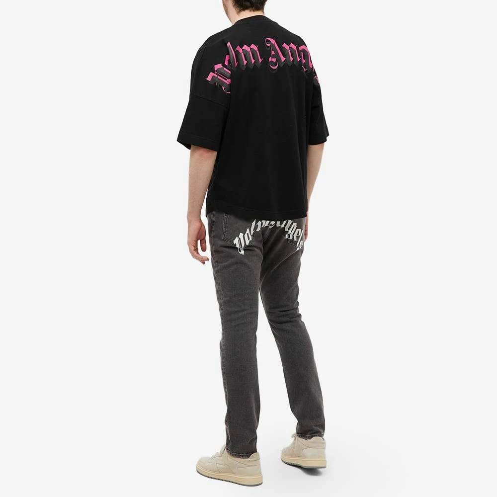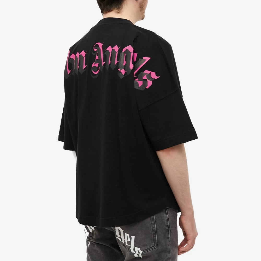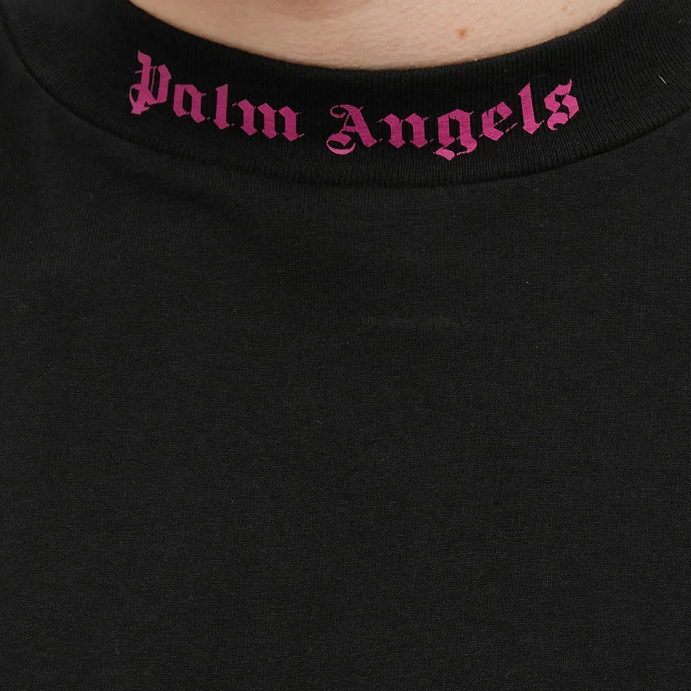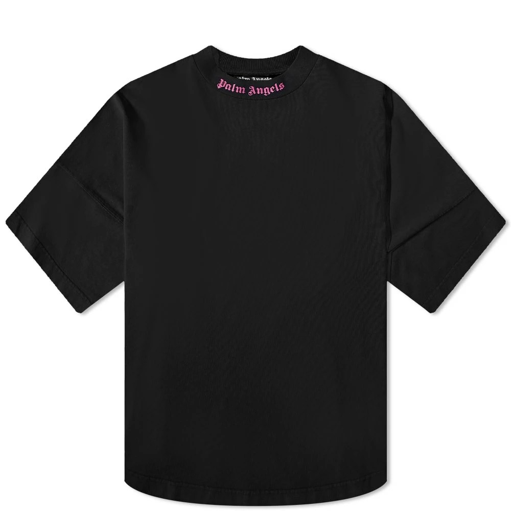 Opt for a gothic streetwear look with this black t-shirt from Palm Angels. Cut from premium cotton, it’s dramatic oversized silhouette is complete with a branded mock neckline and bold 3D-style gothic branding at the back in shades of black and fuchsia.