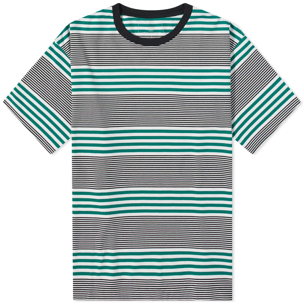 A simple staple from Uniform Experiment – this black and green striped tee is crafted in Japan from super-soft cotton, styled to a relaxed fit and pairs perfectly with your everyday outfit.